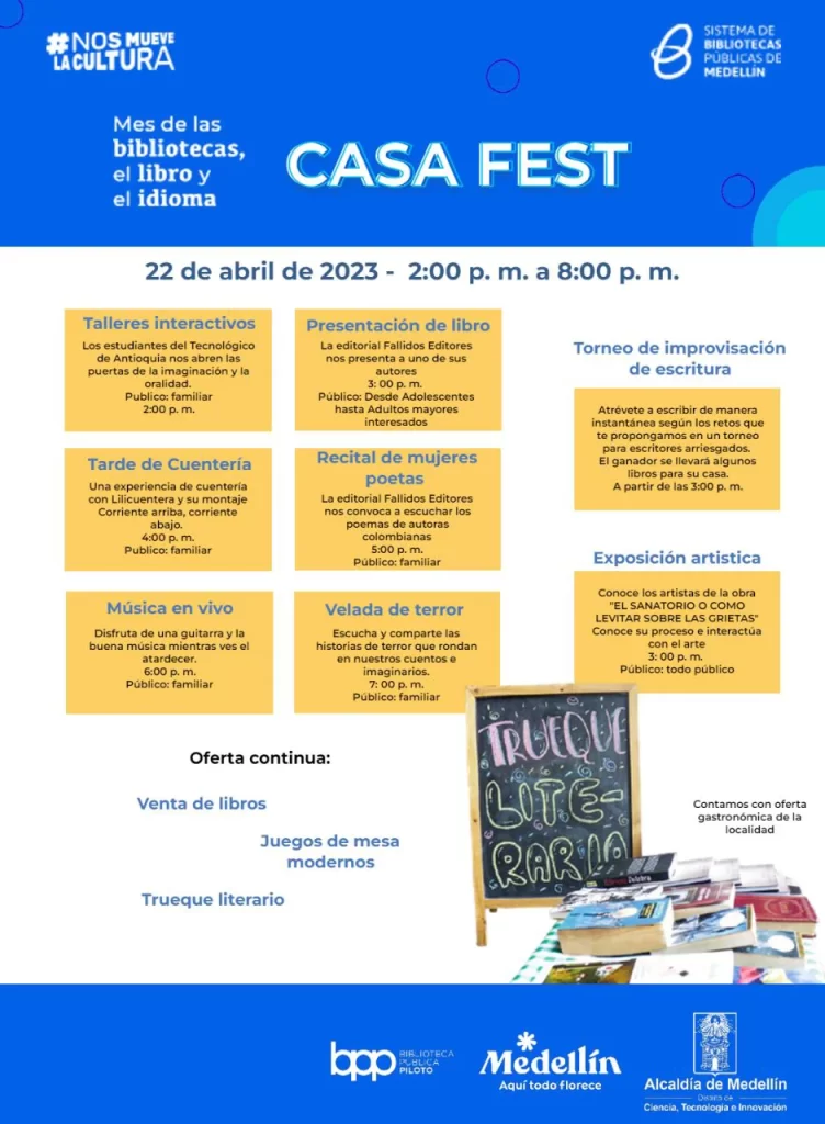 Te invitamos este sábado 22 de abril desde las 2:00 p. m. a disfrutar del Casa Fest en la Casa de la Literatura San Germán. Esta es una fiesta para celebrar el mes del libro y del idioma, y nos recuerda que a través de la estrategia Medellín ciudad lectora, este tipo de espacios públicos permite que los ciudadanos puedan deleitarse del ecosistema literario y cultura que se ofrece desde el Plan Ciudadano de Lectura, Escritura y Oralidad.