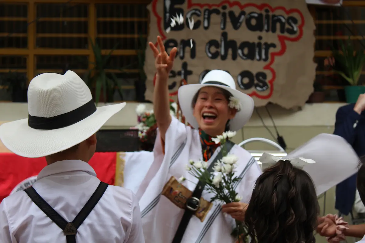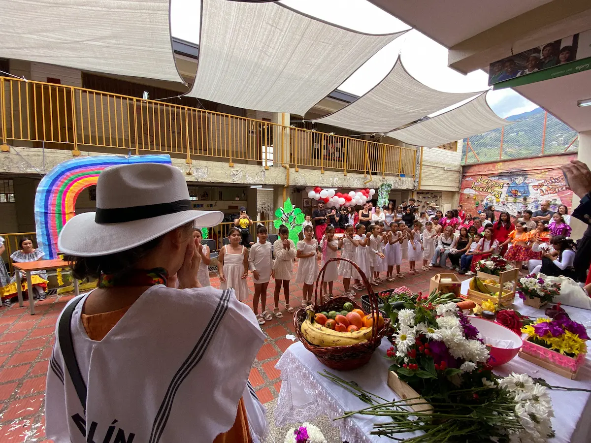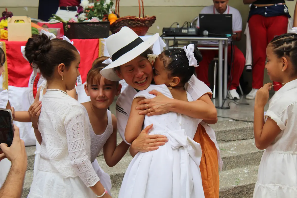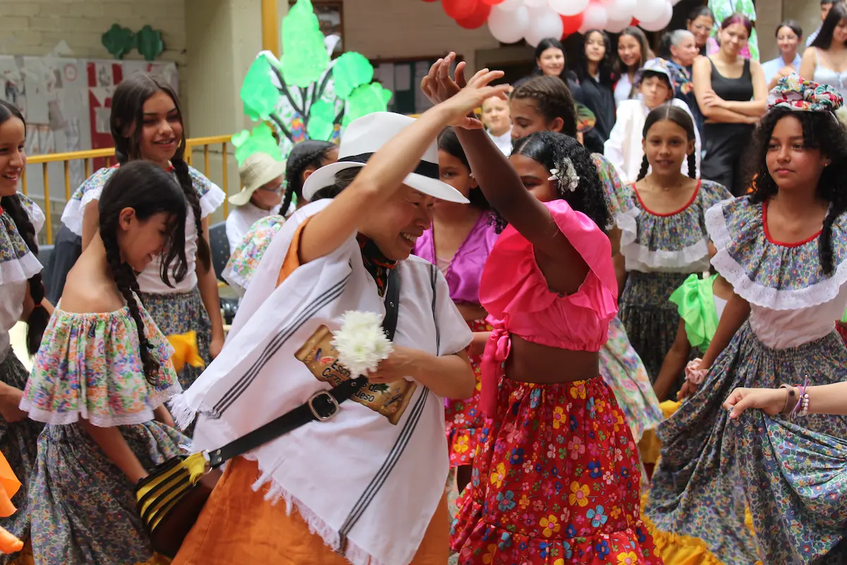El encuentro tuvo lugar en la cancha central del colegio, el mismo espacio donde se celebran los actos cívicos. Desde temprano, las dos jornadas —mañana y tarde— se unieron para darle la bienvenida. Los más pequeños iniciaron la presentación mostrando a Kim la cultura colombiana: la plaza de mercado, las frutas, la comida, la música y el baile. Vestidos con trajes típicos, le ofrecieron una fiesta llena de color y alegría. Kim, visiblemente conmovida, no pudo contener las lágrimas ante la belleza y el cariño de aquel recibimiento.