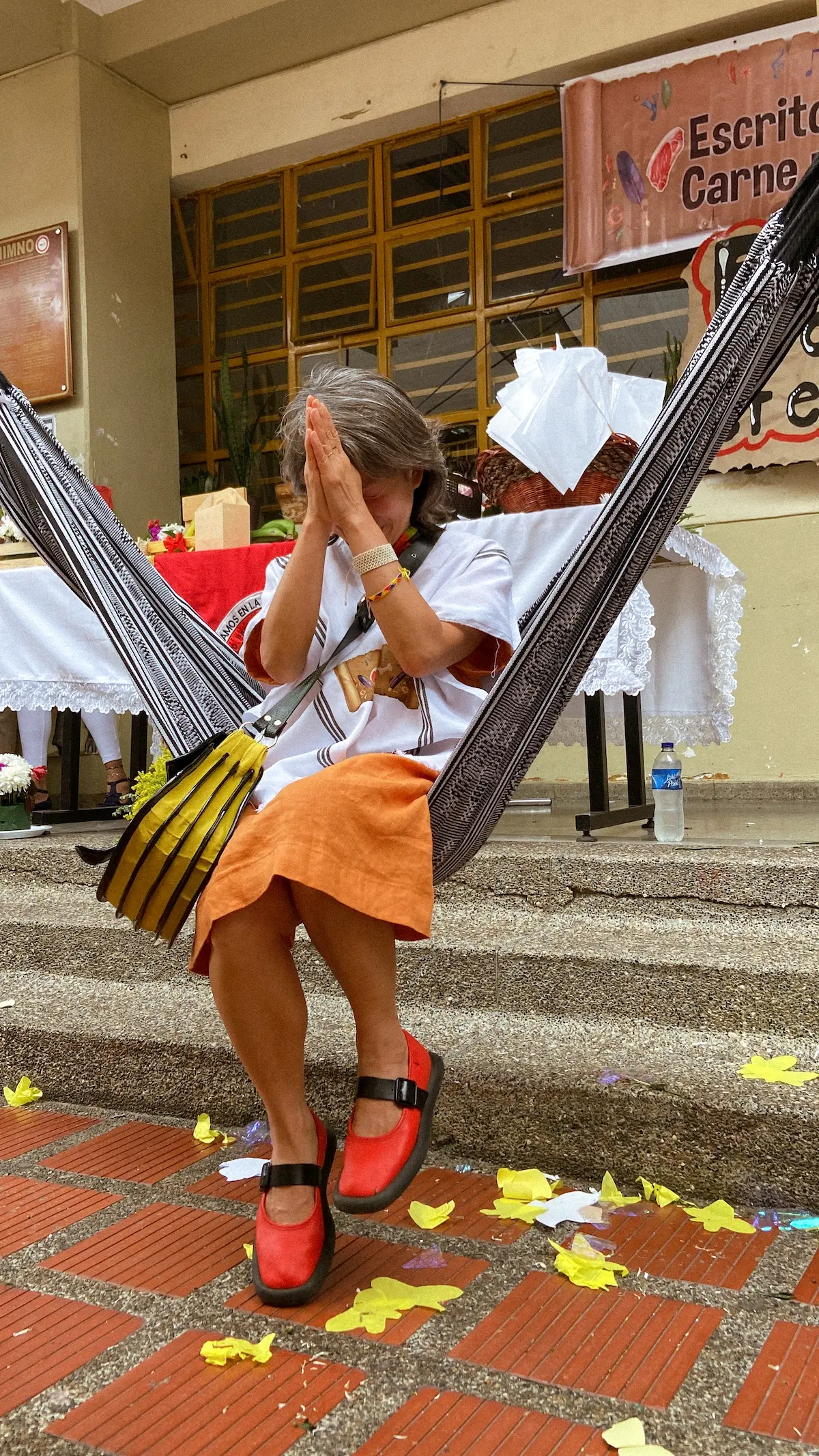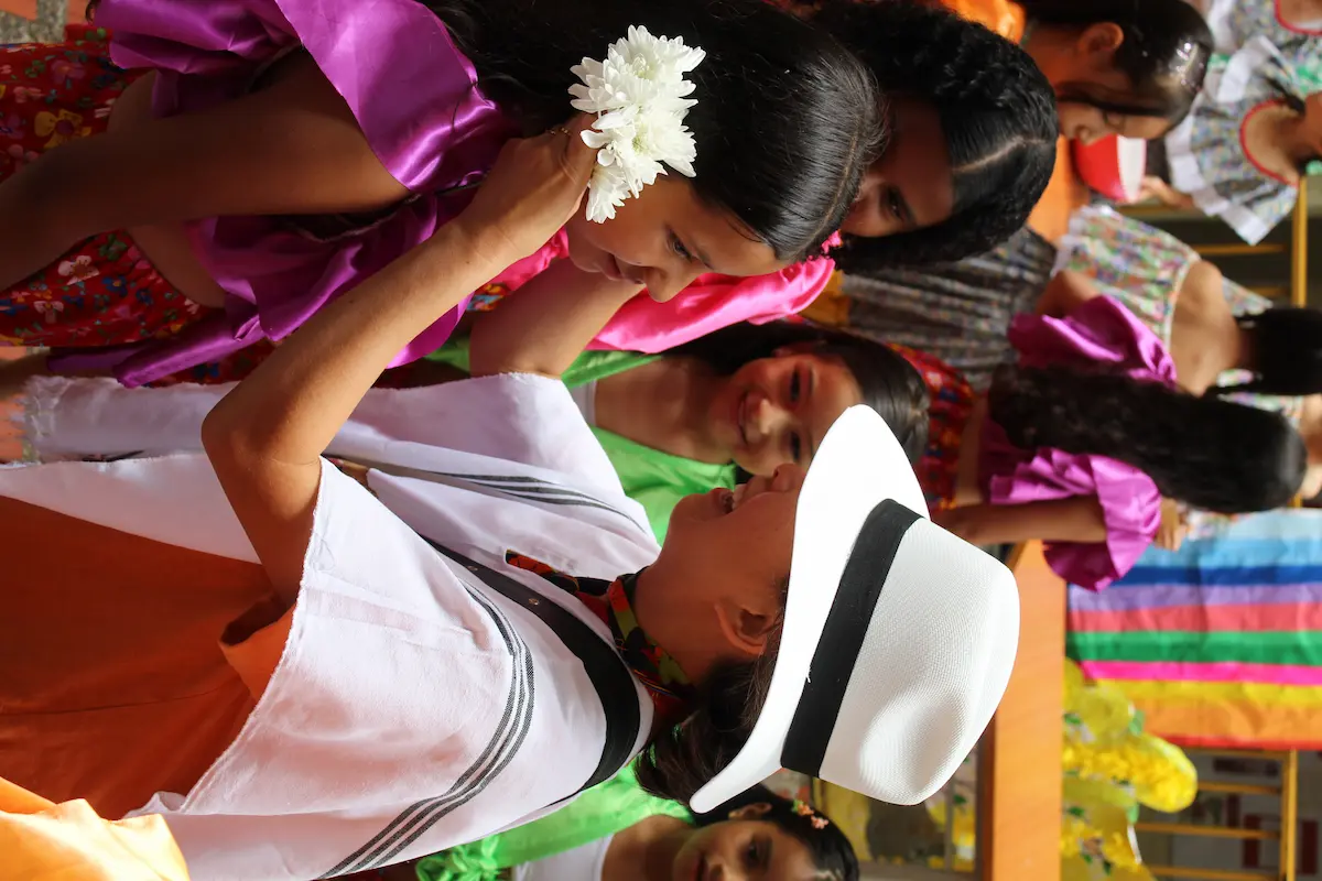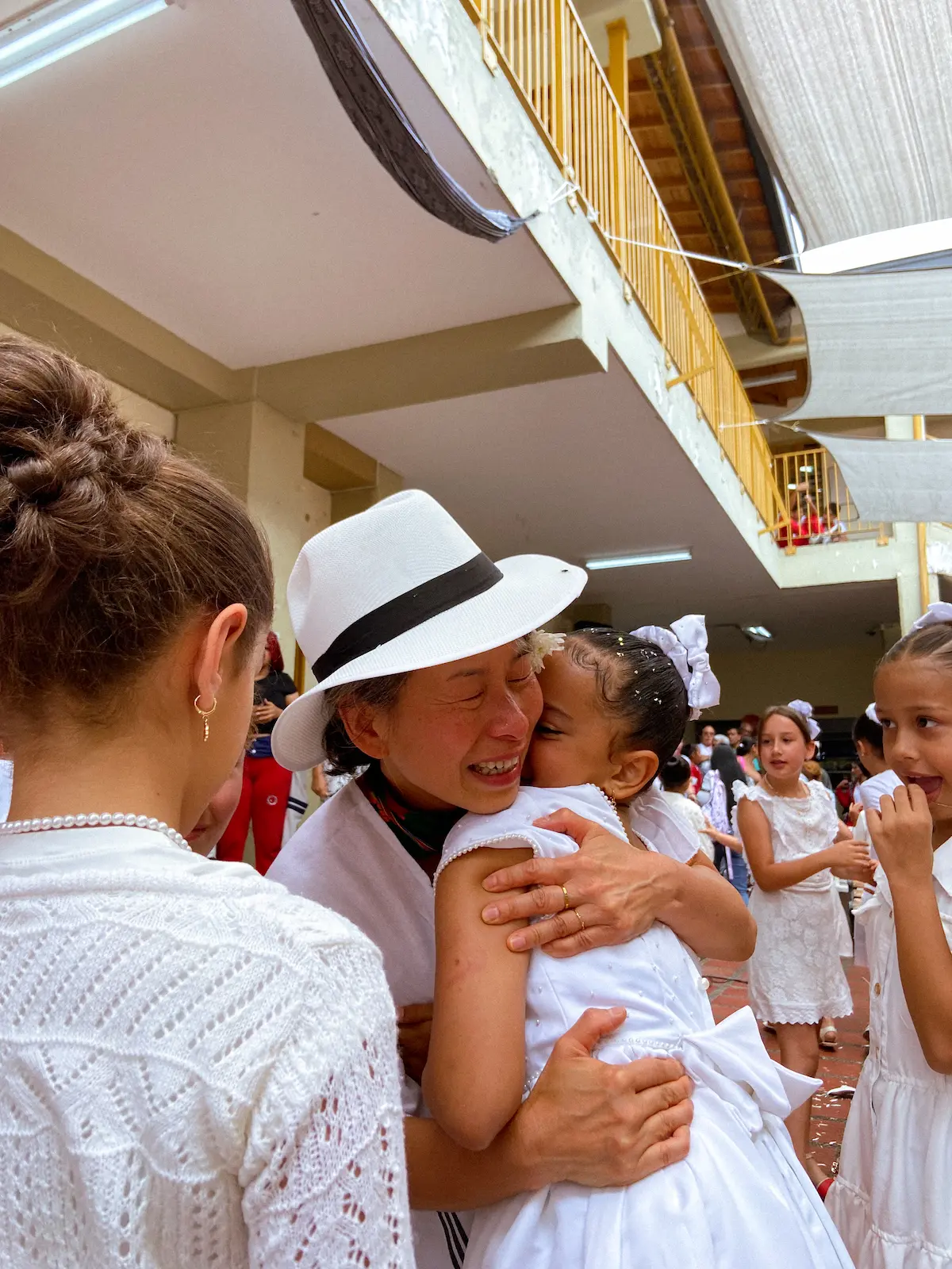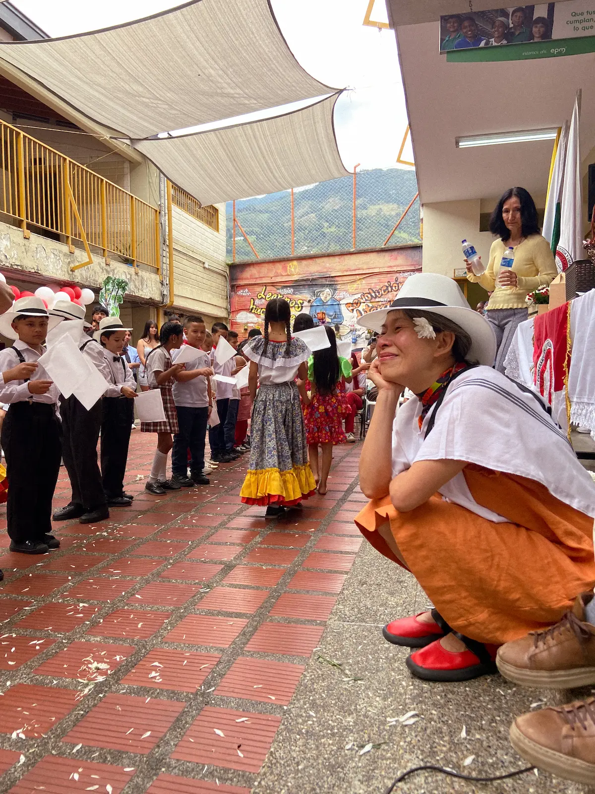 El encuentro tuvo lugar en la cancha central del colegio, el mismo espacio donde se celebran los actos cívicos. Desde temprano, las dos jornadas —mañana y tarde— se unieron para darle la bienvenida. Los más pequeños iniciaron la presentación mostrando a Kim la cultura colombiana: la plaza de mercado, las frutas, la comida, la música y el baile. Vestidos con trajes típicos, le ofrecieron una fiesta llena de color y alegría. Kim, visiblemente conmovida, no pudo contener las lágrimas ante la belleza y el cariño de aquel recibimiento.