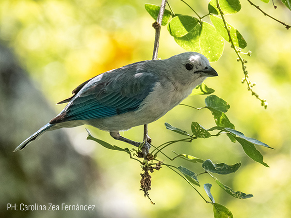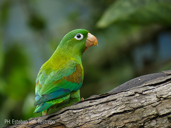 Ave mediana, de un verde intenso y un color azulado debajo de las alas.