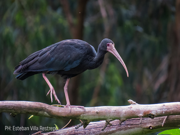 Ave grande, de color negro, con pico largo y curvo de color rosáceo, al igual que su cara y sus patas alargadas.