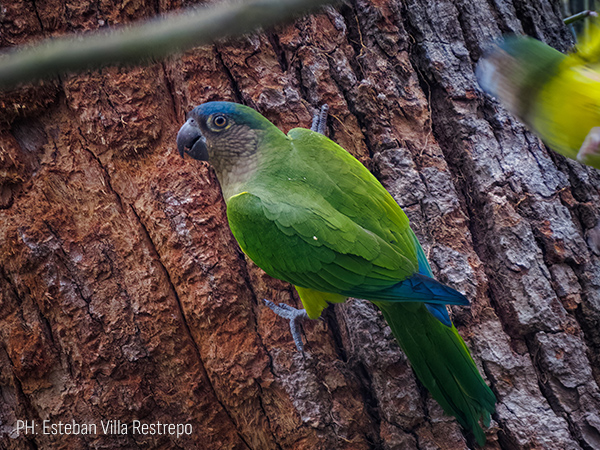 Ave mediana, de color verde y cara café grisácea. Es un poco más grande que el periquito bronceado y se le suele ver en bandadas más pequeñas, aunque igual de bullosas.