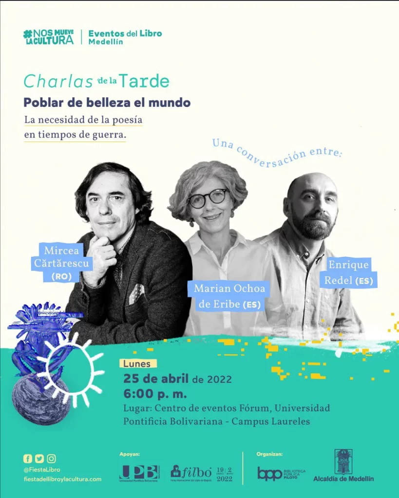 Cartarescu estará en la capital antioqueña el próximo 25 de abril para participar en Charlas de la Tarde, el espacio mensual de los Eventos del Libro de Medellín. Esta conversación, titulada “Poblar de belleza el mundo”, se realizará en el Centro de Eventos Fórum de la Universidad Pontificia Bolivariana (campus Laureles) a las 6:00 de la tarde, con entrada libre. Esta actividad es posible gracias al apoyo de la UPB y de la Feria Internacional del Libro de Bogotá, Filbo.